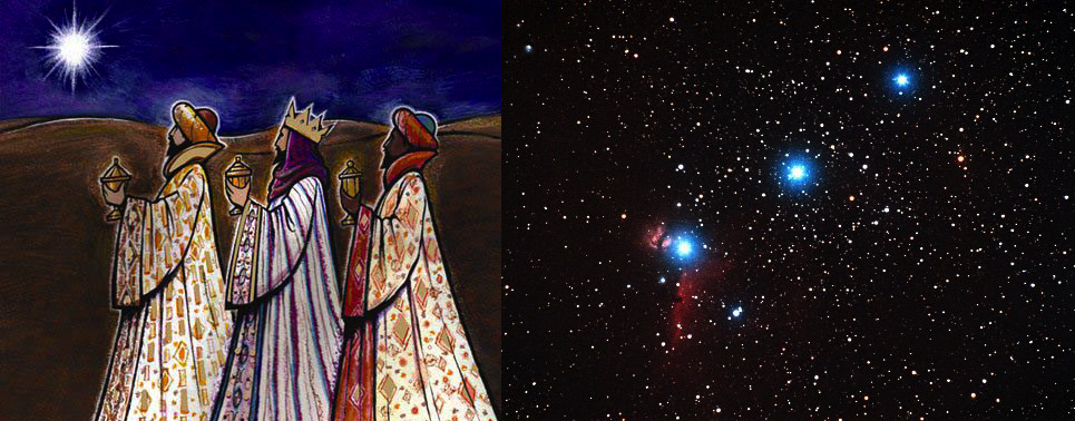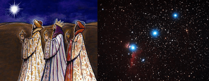 For longer than recorded history the constellation of Orion has risen in the East, traveled across the sky and set in the West. 3 distinctive stars across his midsection (pictured above, right) are known as Orion’s Belt. They are also known as “The 3 Kings” by many cultures and even modern astronomers.